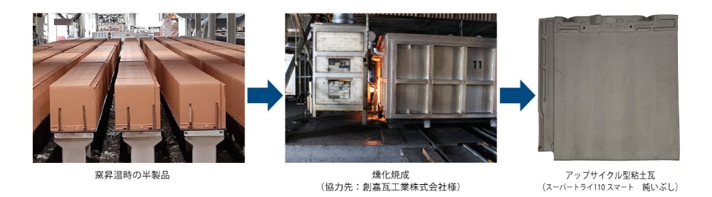 純いぶしはメンテナンス後の稼働においてできる半製品(株式会社鶴弥)を再度燻化焼成(創嘉瓦工業株式会社)することで製品としたアップサイクル型粘土瓦です。